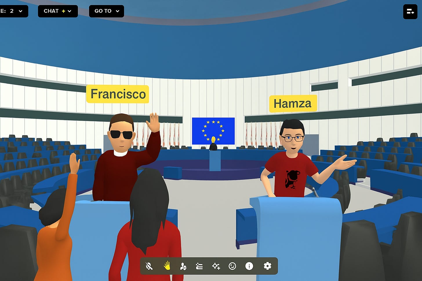 The Galleries opened the arc: a quiet hall filled with reconstructed testimonies, treaties, and fragments of Europe’s turbulent past. From there, they moved into the Agora, a bright courtyard where avatars glowed in real-time conversation. Soon the silence of the Gallery gave way to a controlled chaos of dialogue. Then came the Parliament Hall, where discussion turned procedural. Microphones turned on in sequence, votes appeared on curved screens, and argument met consequence. The space encouraged focus, but not uniformity; it was coded to equalise access, not opinion. Finally, the Activity Rooms invited participants to redesign democracy, laws, institutions and procedures. Each room embodied a phase of democratic practice: remember → reason → decide → imagine.